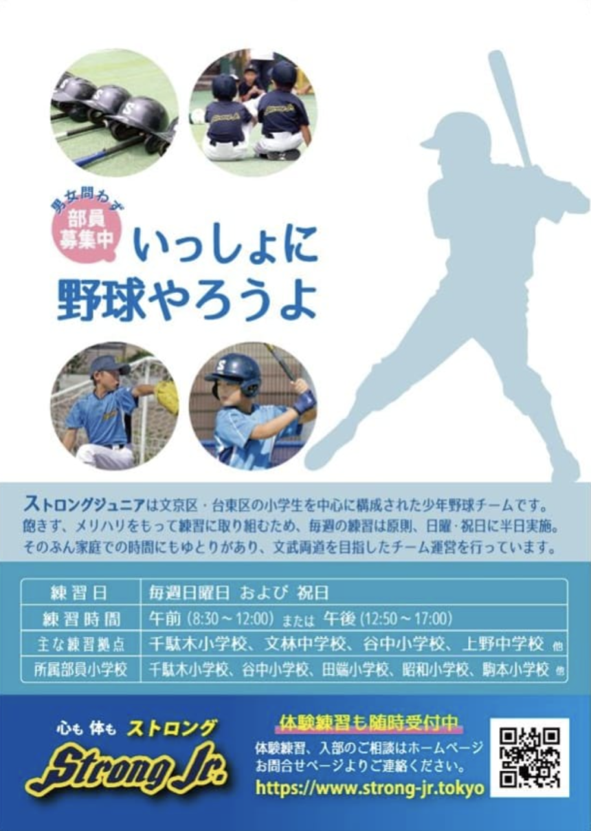 ストロングジュニアは文京区(千駄木地区)、台東区(谷中地区)の小学生を中心に構成された少年野球チームです。千駄木小学校、文林中学校および谷中小学校を拠点に活動をしています。当チームは歴史が古く、多くの諸先輩方や卒業生のお力を借りながら運営してきております。