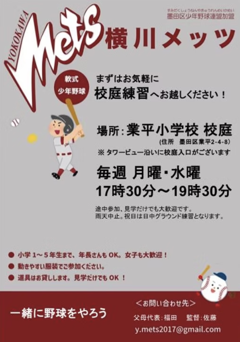 横川メッツは創部50年を誇る墨田区(#業平小学校 #柳島小学校 #錦糸小学校 #緑小学校の子供たち)を中心に野球を通じて「感謝・礼儀・団結力」をモットーに活動しています。