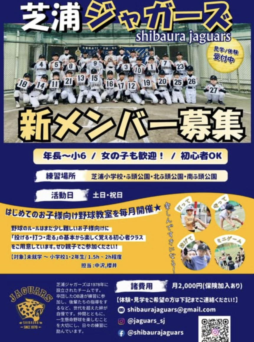 芝浦ジャガーズは港区芝浦小学校を活動拠点とした1978年に設立された少年野球チームです。