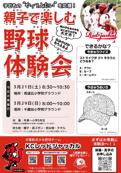 2002年に「希望丘レッドサンズ」と「粕谷ジャッカル」が統合して誕生した学童軟式野球チームです。