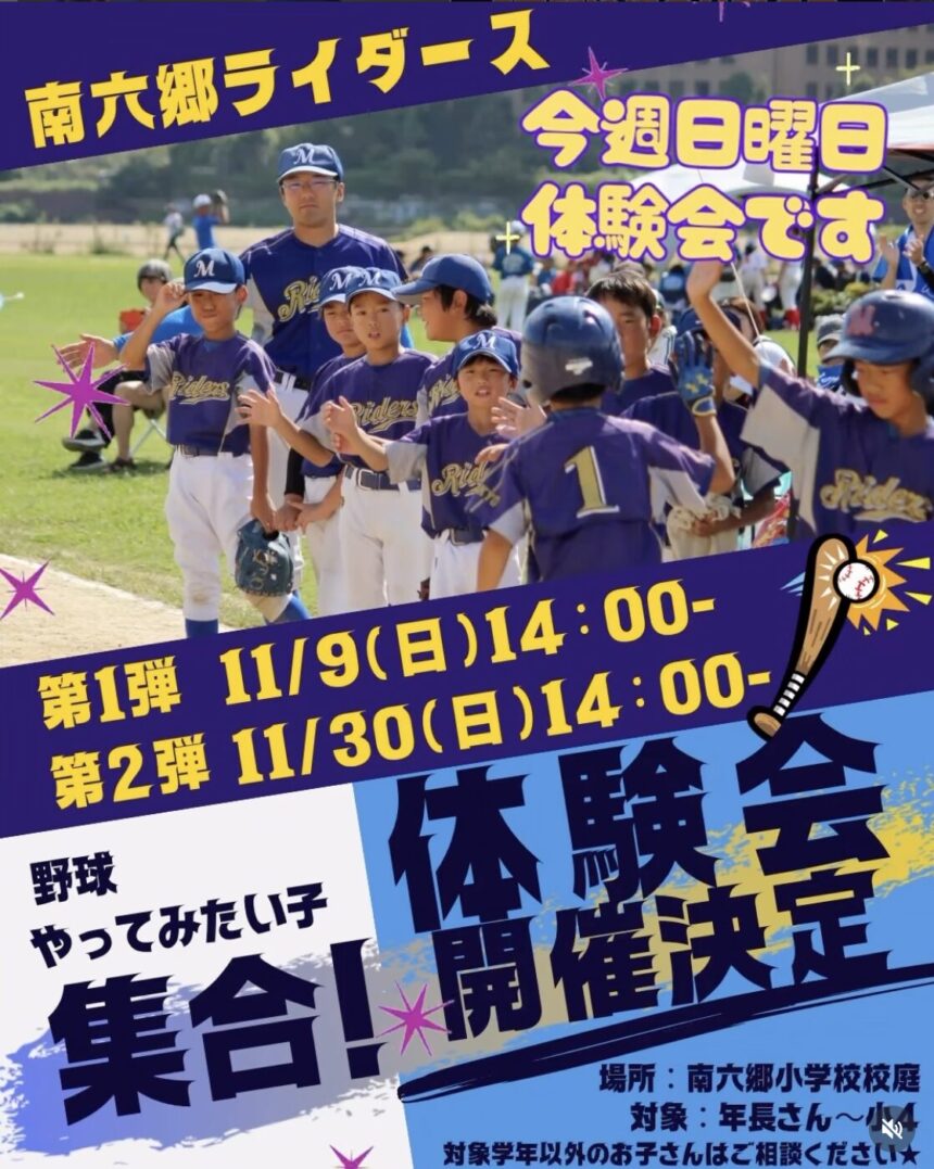 東京都大田区南六郷を拠点に1970年創部の50年以上の歴史を持つ少年軟式野球チームです。南六郷小学校を中心に東六郷・西六郷・出雲など近隣小学校の子どもたちで構成。「勝つことが目的ではなく、野球を好きになる・人間的に成長すること」を大切にしています。女子部員も在籍し試合でも活躍中。学区不問で初心者から入部可能。スタッフ3名が全日本軟式野球連盟公認学童コーチ講習修了済み。体験練習・見学はいつでも受付中。