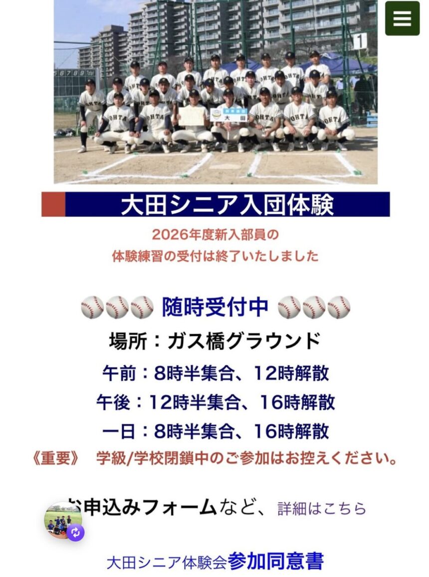 1972年創設(目黒リーグのリトルの部として発足)・1975年シニアの部発足。50年以上の歴史を持つ大田区の中学硬式野球の名門チームです。元プロ野球選手の副島孔太氏が総監督を務め、大田シニアOBによる指導体制が整っています。小6から入団可能で、高校野球を見据えた本格的な硬式野球を早期から経験できます。AEDをグランドに設置するなど安全管理にも力を入れています。体験練習は随時受付(新2年生のみ)。