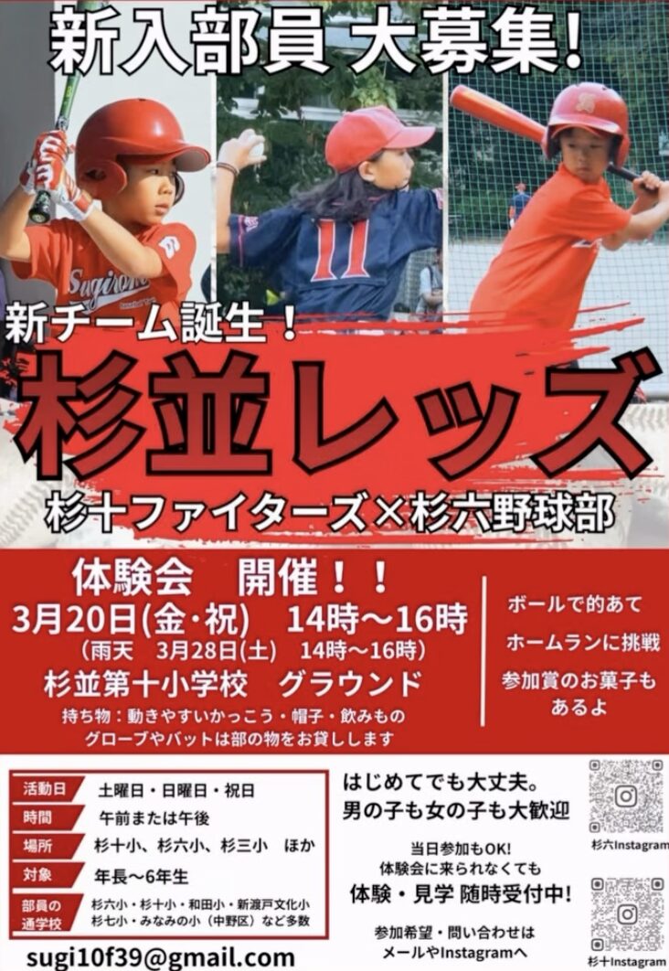 杉並レッズは、杉六野球部と杉十ファイターズが合併して誕生した杉並区の学童野球チームです。